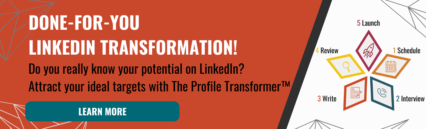 If your LinkedIn presence doesn’t reflect your professional self, now is the time to bridge that gap. The Profile Transformer™ engagement takes away the guesswork and heavy lifting for you, delivering a LinkedIn footprint you can feel confident is putting your best face forward. This proven process is straightforward to systematically revamp your profile the right way.